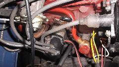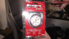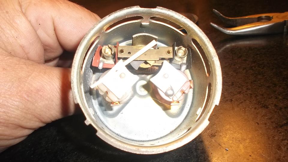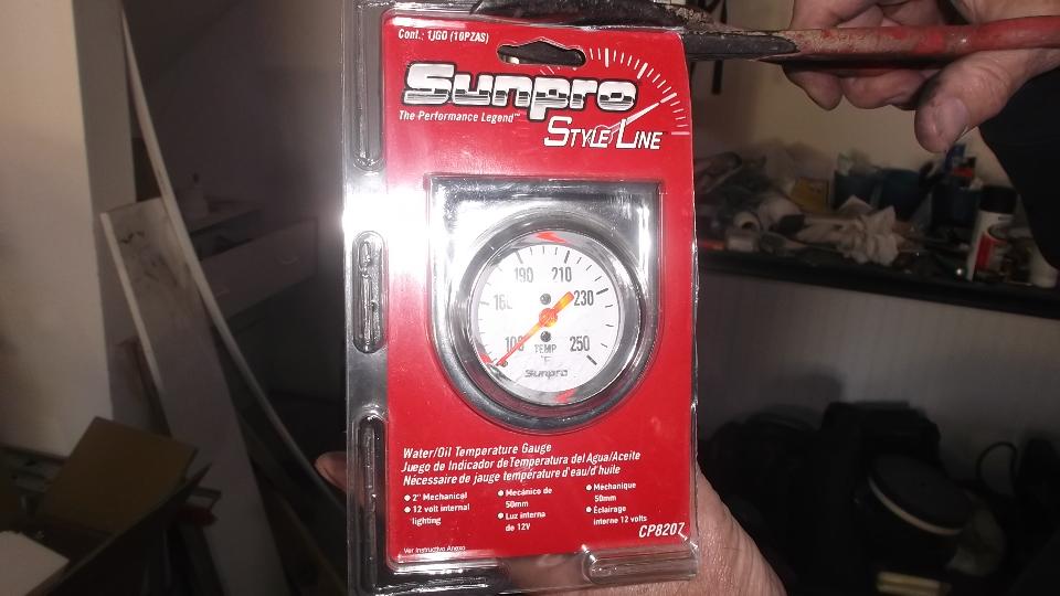 Ron picked up a cheap analog temperature gauge, Sunpro CP8207 $17.99-USD from Advance Auto Parts, from which we would (maybe) transfer the pipe and bulb with working fluid in tact to the old gauge. Unfortunately he didn't read the web page well enough, so the small brass tubing he procured for the connector piece was too fat, and the job was stopped in mid stride. Bummer. As a follow up I retrieved a working safety gauge from the traveling parts box in my trailer, tested it in boiling water, and left it with Ron for installation. We may get back to this gauge repair project later.