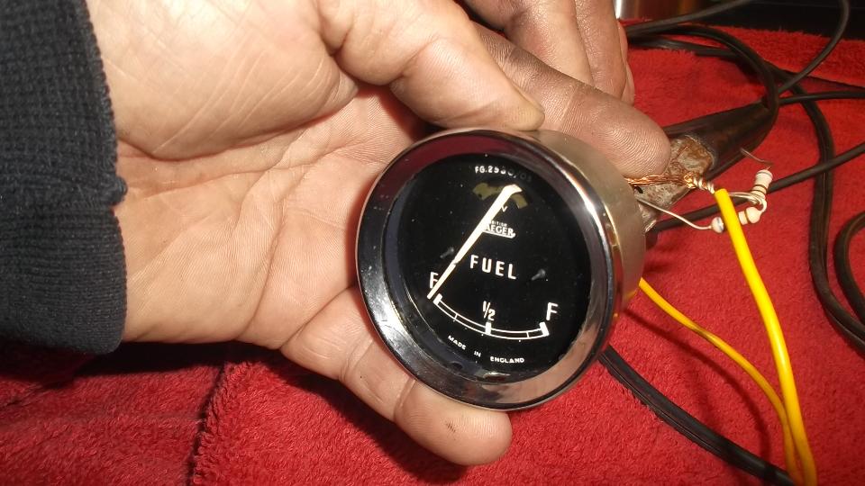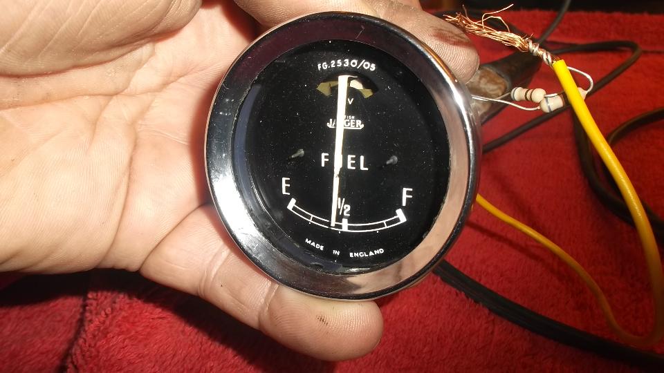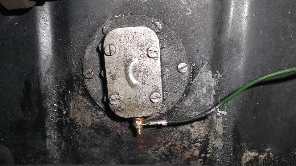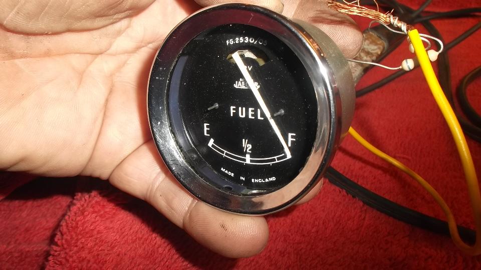 Today was a garage day. We installed the repaired fuel gauge, then went after the fuel level sender unit. Like the gauge, the stud and nuts were loose so it would likely have bad electrical connections. I was surprised it wasn't leaking fuel, but then it had been sealed all over with Hylomar, so we lucked out. Remove the lower nut and wire, tighten the upper nut, replace the wire and lower nut, and tighter securely. Ah, all is well with the world, as the fuel gauge works immediately when tested with resistors at the tank end of the signal wire.