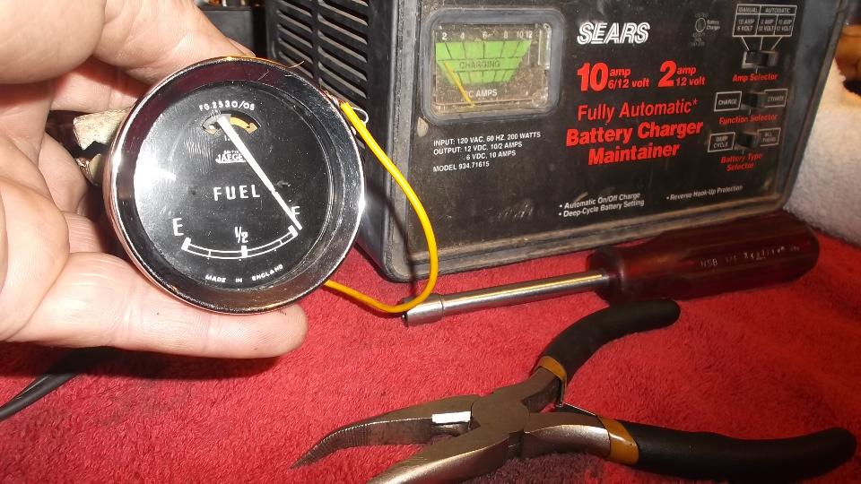 By late afternoon we were investigating a jumpy fuel gauge. Touch any wire or tap the glass and the gauge would go nuts, something loose inside the instrument, so it had to come out of the dash for repair. Sitting at the kitchen counter with a battery charger for power supply and a pair of 68-ohm resistors in hand, we proceeded to disassemble the fuel gauge (not for the faint of heart).
