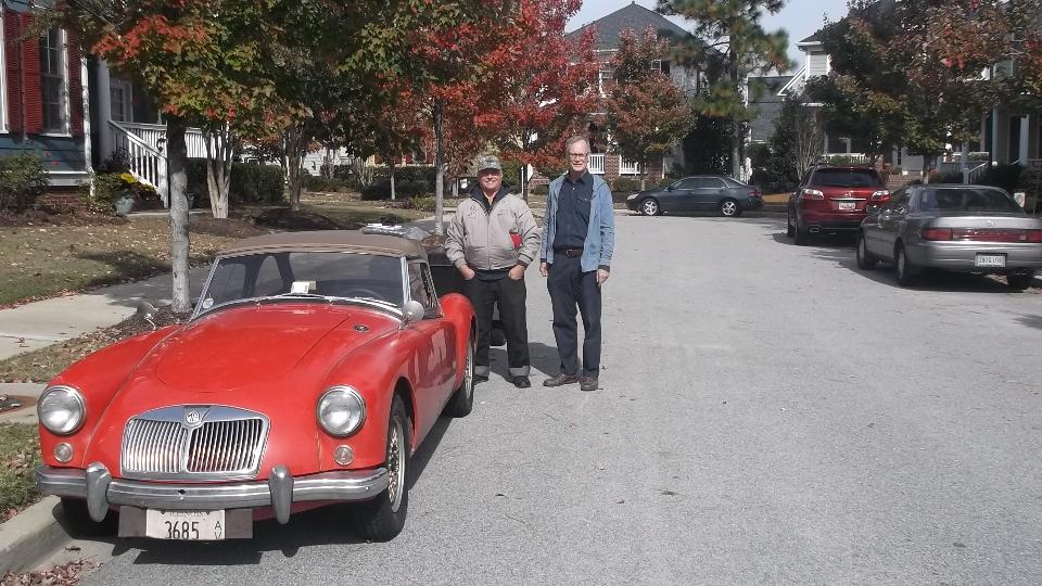 But we're not finished yet. Having lost daylight savings time, darkness falls early as we head north to Monroe, NC, again. Here we are to visit Ronnie Laney who has an MGA 1500 with 1800 engine. This has body and interior restoration done some time ago, looking pretty nice, but has not run for a few months. We would have fired it up, except it had very dead battery.