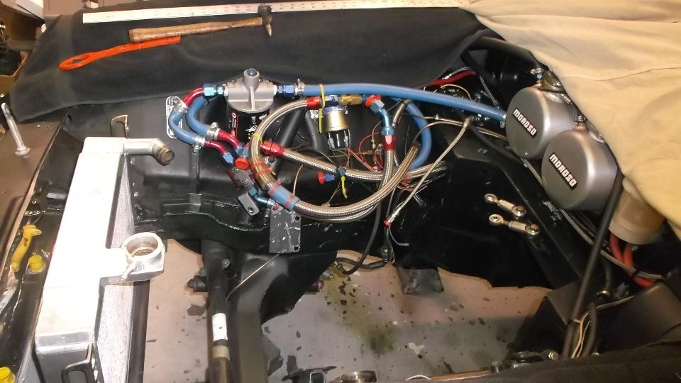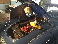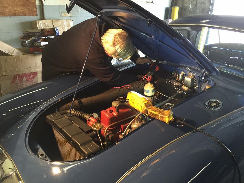 Today I was busy with the club newsletter, but I seem to have lit a fire under Ron to get him motivated. He spent most of the day re-forming the air pan on his MGA to move the radiator forward enough to clear the (big plastic) fan on the 1800 engine, getting the radiator installed, and engine running.