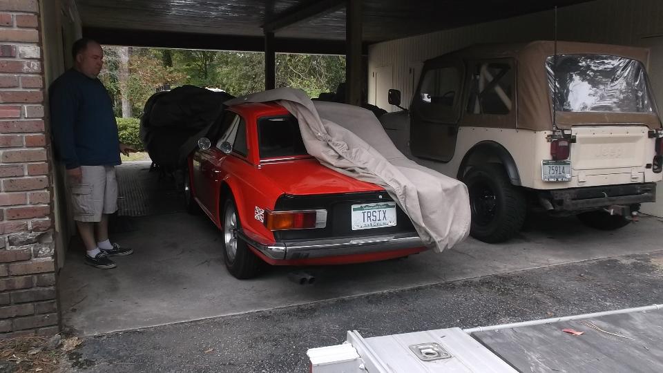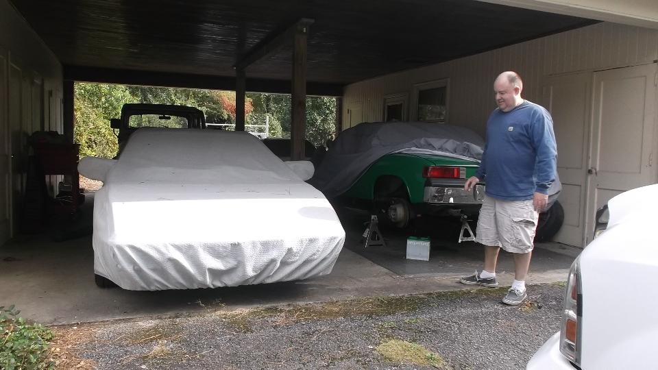 Heading north through South Carolina, we finally get a beak from expressways in the dark and take some side roads in the daylight. We have cotton fields down here. Just across the state line we meet John Kennally in Marvin, North Carolina. The happy step goes with a couple of nice MGs.