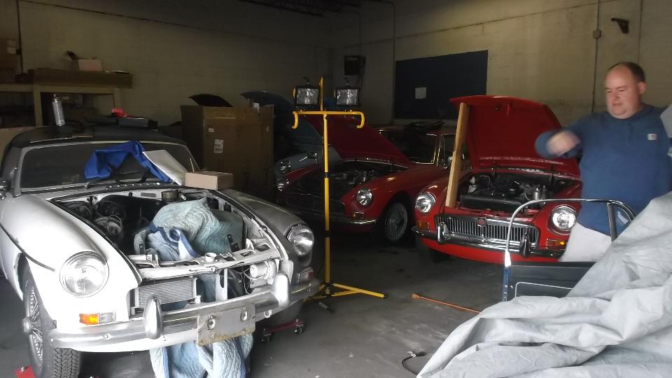 A photo missed yesterday, the second storage bay filed with MGCs, and the black MGA roadster. That one has a sticking choke jet, which will need some attention another day. Photos below from Bill Howerton.
