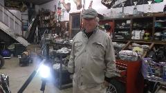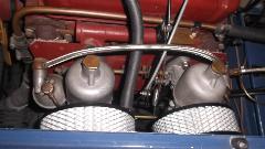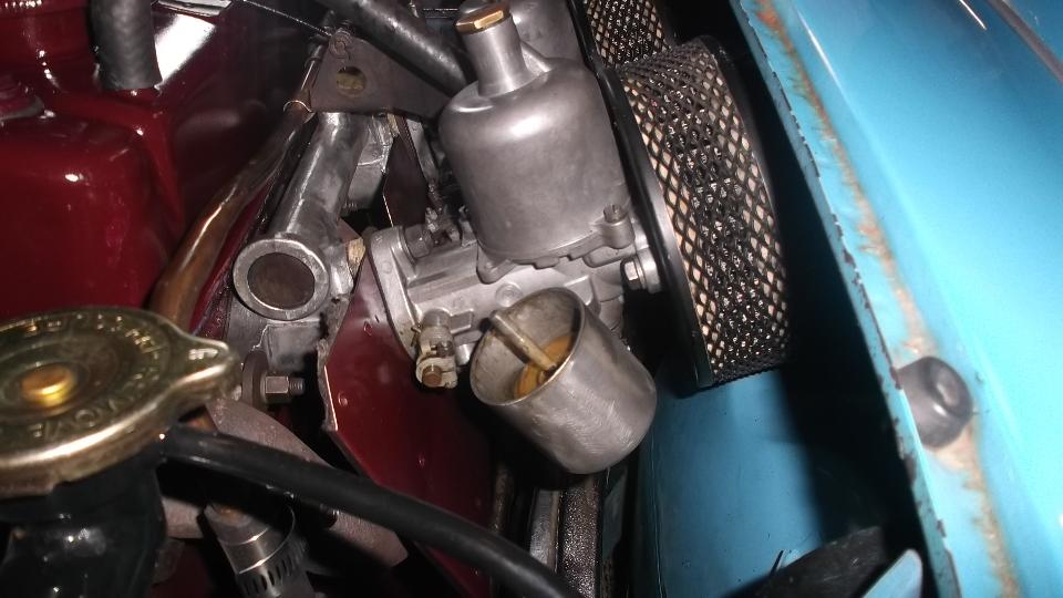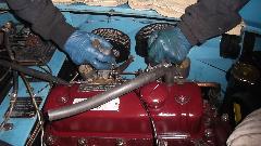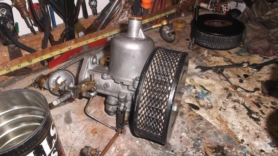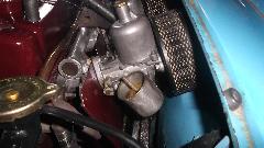 After a little chat and dinner, John thinks his MGA could maybe use a tune up, so fire it up and we'll see what it sounds like. Uh, sorry, but it sounds like crap, so shut it off. The float chambers are on back to front hanging at an odd angle, the jets are leaking profusely because the gland nuts are loose, the jets are sticking on half choke, and the needles are binding on misaligned jets. This calls for full dismount for un-stick and reassembly with proper alignment.
