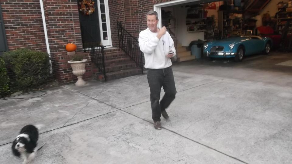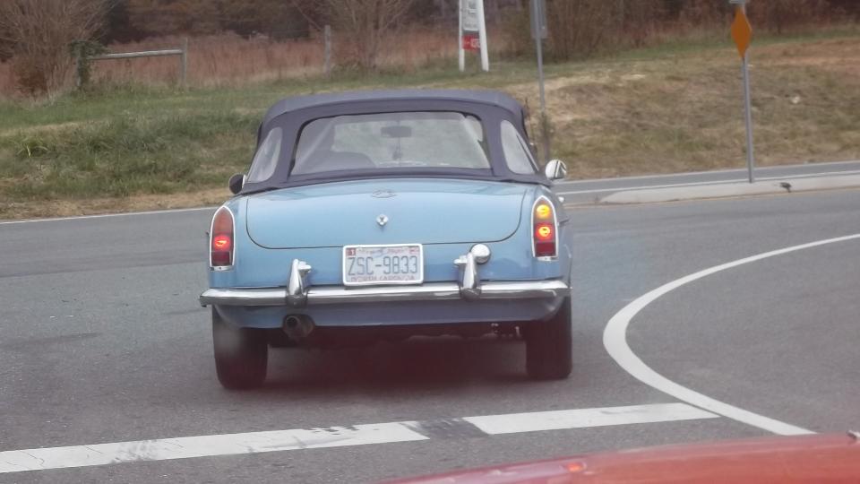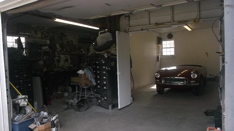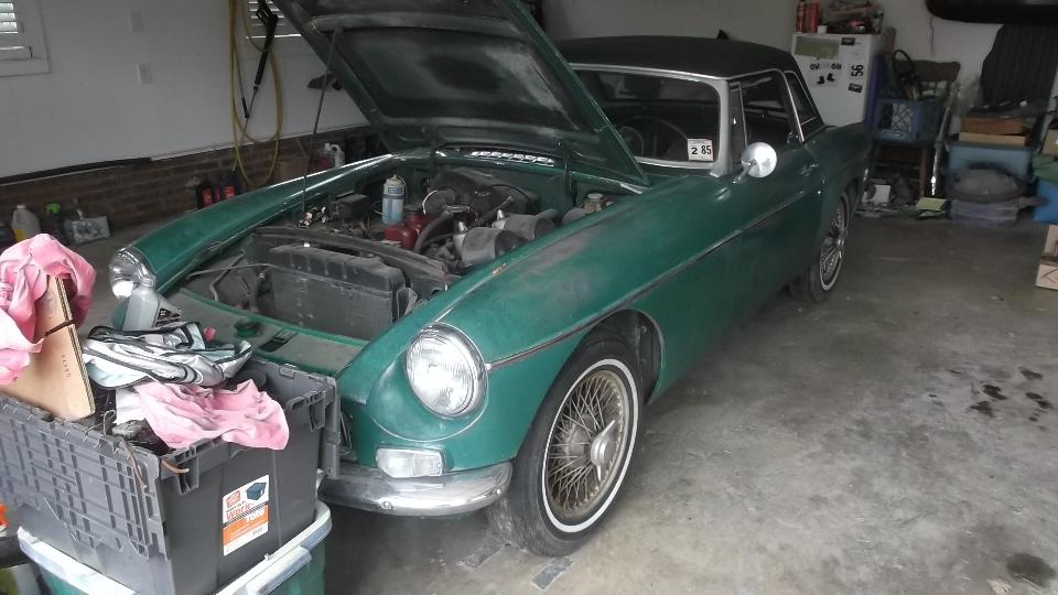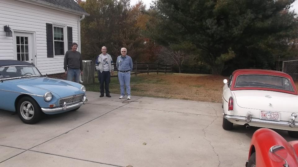 A short jaunt today to Monroe, NC, to visit Bob and Lynda White. On arrival Bob and a couple of neighborhood friends are on hand to greet us. The blue car is Bob's beautiful 1963 pull handle MGB, a nice daily driver car. Next up is another MGB wearing a hard top and sort of begging for a repaint. It occupies the center space of the two car garage, leaving space for Lynda's daily driver car, a newer Mazda Miata (not currently present).
