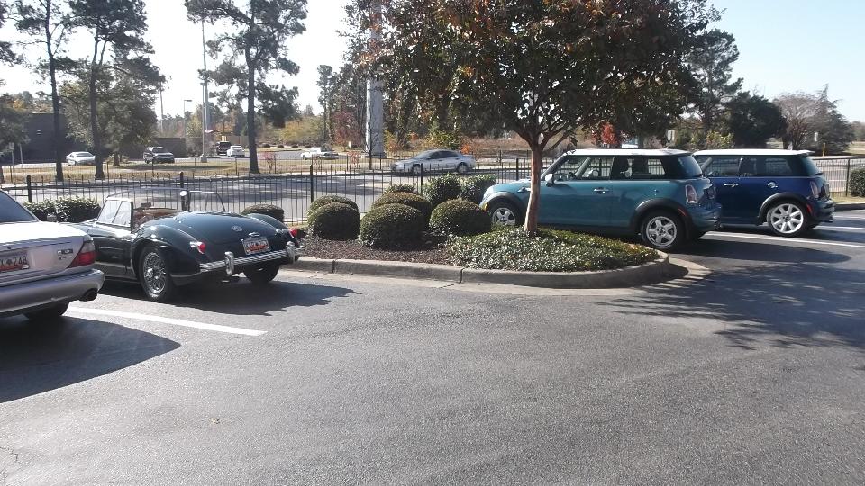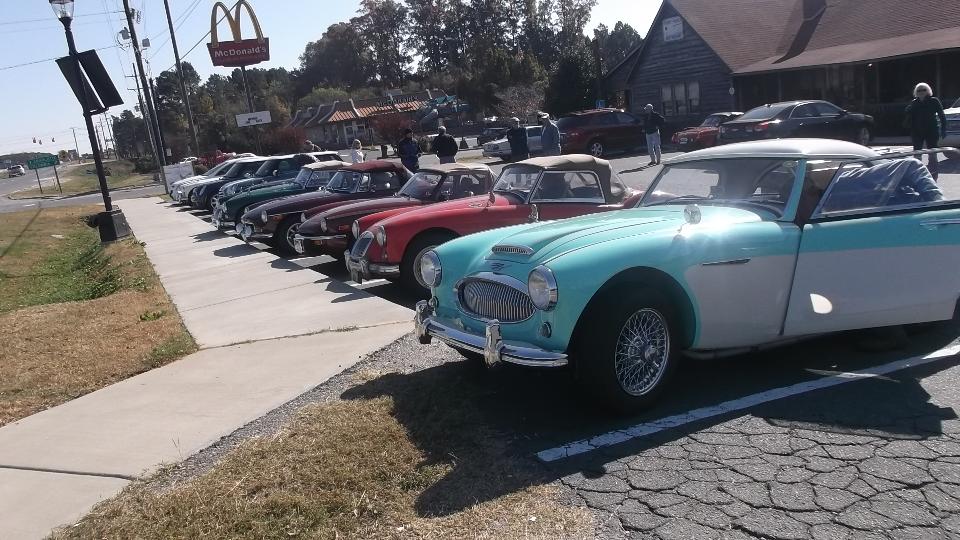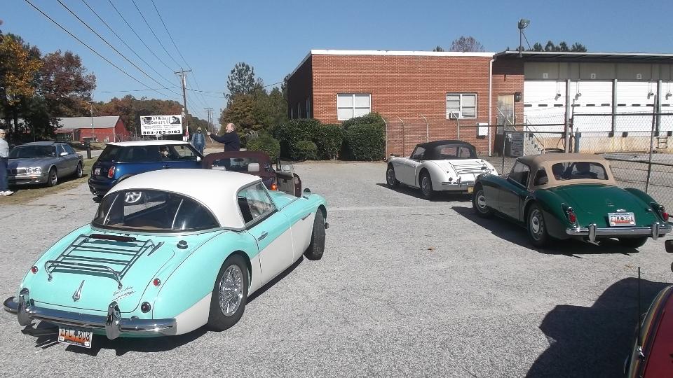 Busy, busy day today. 5:30am alarm, out the door around 6:15, about 200 miles cruising (mostly expressway), arriving Blythewood, SC 9:30 in prep for 10:00 meeting with British Car Club Midlands Centre (remember the dinner meeting two weeks earlier). Today there is a "Drive to Richburg" (tour rally) where we stopped for lunch at The Front Porch. I found 3 MGA, 2 MGB, 1 MG ZB Magnette, 2 AH 3000, 1 TR Spitfire, 1 Jaguar XKR, 2 new Minis, and pretty sure I missed a couple more.