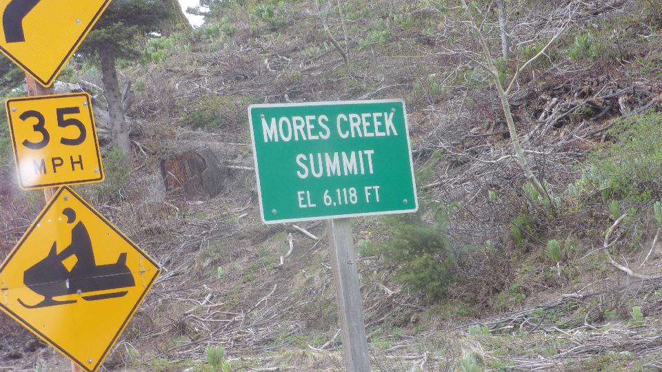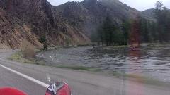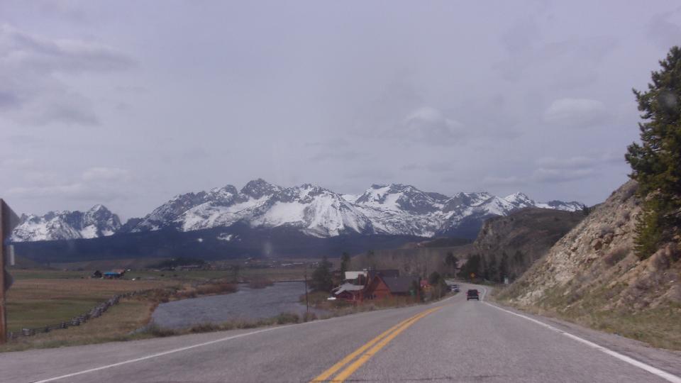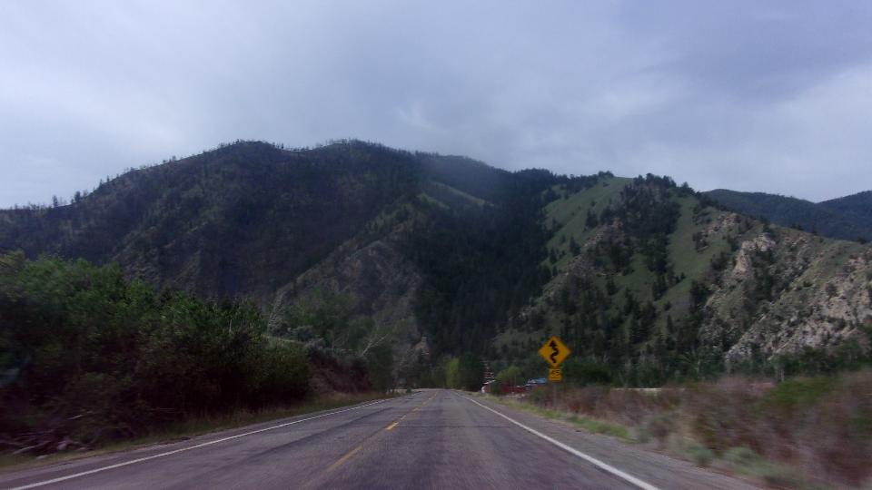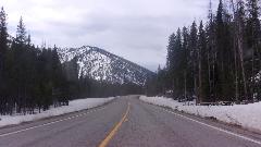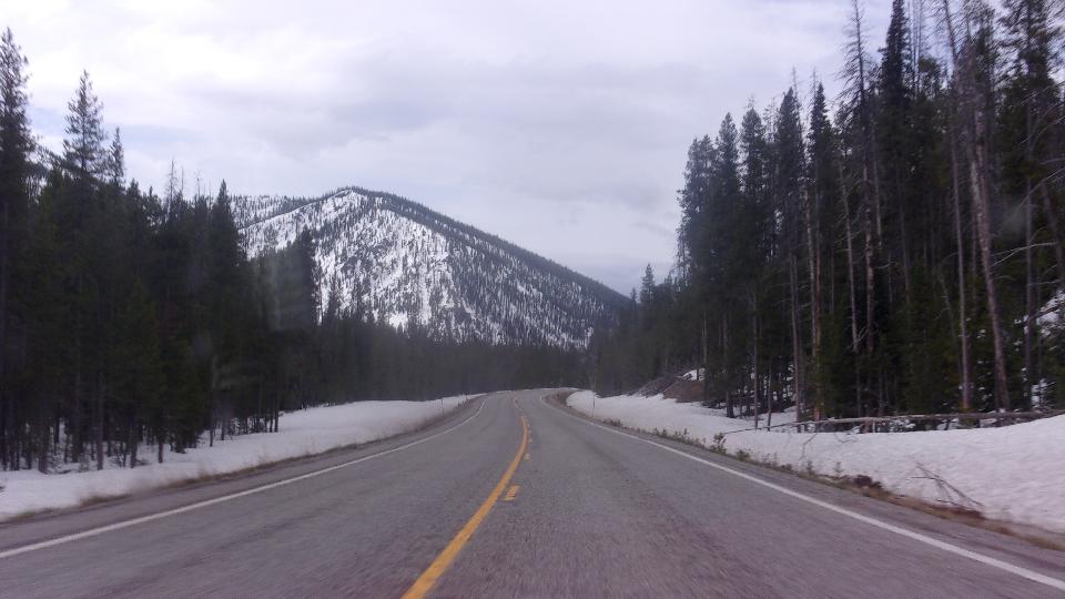 Awake before 8-am, no rain or wind, and a better view of the remaining snow banks, sitting just over 7000 feet on the state line. We rolled it down hill in 2nd gear for a gentle start, and we were on our way. The first grade was 38 miles down through the switchbacks, could have coasted all the way, but had the engine running for the heater to work some. Following a river or creek on one side or the other much of the time, we were dodging rocks in the road and some burned trees that had slid or washed down the hills into the road. Some trees had been sawed or blasted to clear the road. An hour on we did a quick stop for breakfast pick up. Another hour on a fuel stop. then we hung a right onto ID-75 for 55 miles, and another turn onto ID-21 for another 125 miles