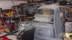 Nice big shop with a bit of British content mixed with a lot of newer stuff. The primered panel left and center is the supercharger cover for an MG K3 Magnette, plus a fender and a few more body parts waiting for paint. There was a Porsche 356 Coupe in back, also about ready for paint.