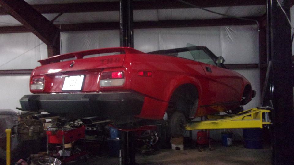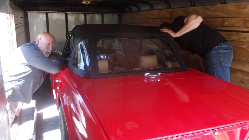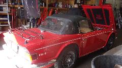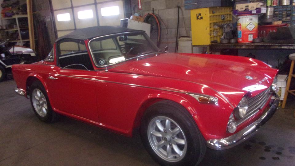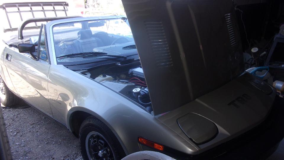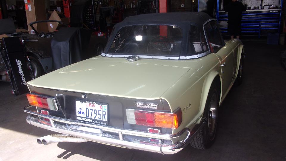 The TR8 from the morning club meeting showed up for inspection, quickly determining it had a frozen McPherson strut on right front, so that one was scheduled in for a Monday service call. On the way out we were checking out a very nice TR6 in a trailer.