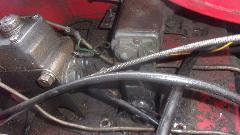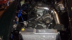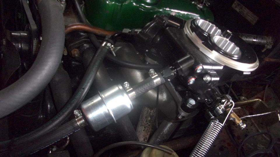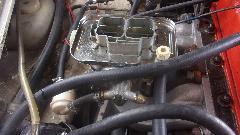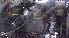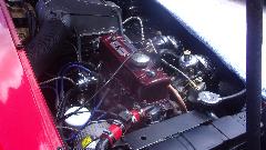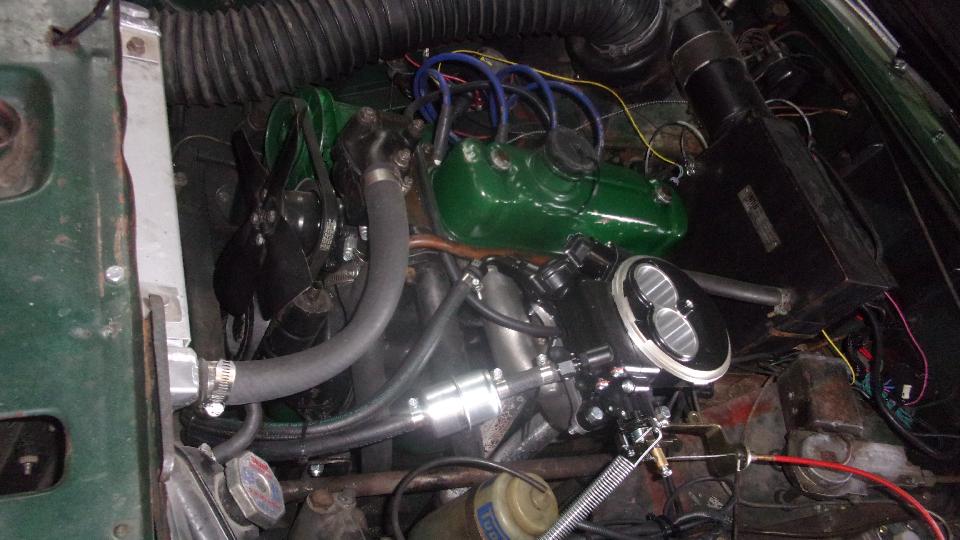 I have to give special attention to one of his pet projects. It is a 1275 MG Midget with throttle body fuel injection. The intake manifold is same as for a Weber 2-bbl downdraft carburetor installation. There is a mass air flow sensor in the throttle body, and an oxygen sensor in the exhaust manifold. With switch on there was a small geyser of fuel out the top (cold start priming I suppose). Then it cranked right up with fast idle, and settled down to a very nice slow idle in a few seconds. It had very good throttle response and sounded great where it sat. Sorry, but no more info about the controls or how it drives. If interested, call Butch.