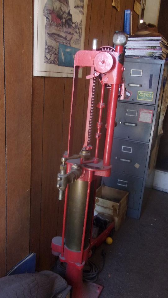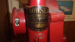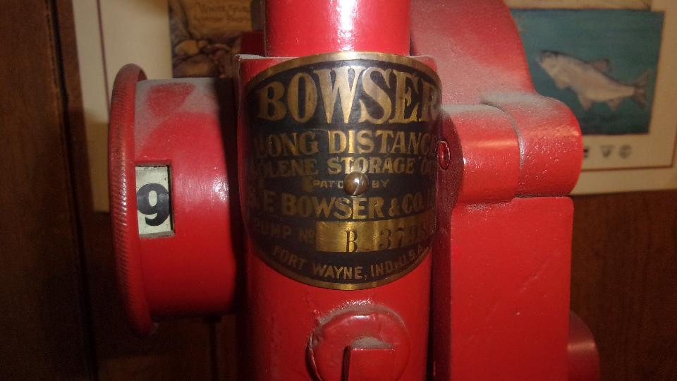 current market value. On the right a Bowser. Yes, a real Bowser gas pump from the days before glass jars on top. Rack and pinion gear allow the crank to lift the large pump piston. Mechanical stops are preset for 1-pint, 1-quart, 1/2-gallon, and full stroke makes 1-gallon and trips the counter arm up top. Jolly good fun.