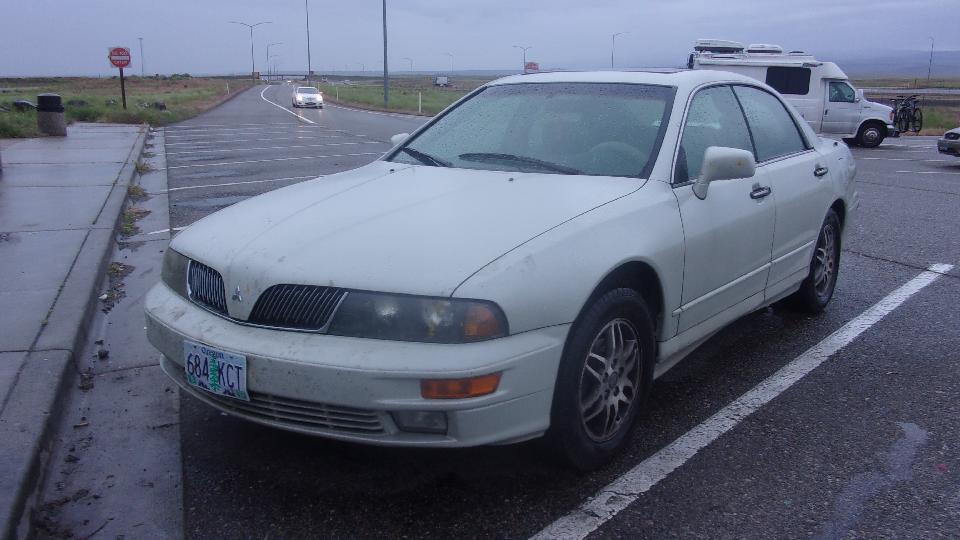 Lots of WiFi work, and it was midnight before we headed out of Boise, so I can call this Sunday. We rolled on 80 miles southeast to Bliss Rest Area on I-84, misty and cool. On arrival we found a Mitsubishi in distress, which drove in, stopped, and would not restart. Lady had called her son (30 something I suppose) who arrived with a new starter and alternator (not knowing what was wrong), and he was fiddling with it when we arrived, a scissors jack in hand and some tools on the ground, kind of lost I think. Key on, things light up, including headlights. Turn key to "Start" and nothing happens, not even a little click. Starter underneath in front, pre-engage gear-reduction type, needed testing. So I lent him our floor jack and jack stands, and a few more tools. Soon up on stands, jumper wire in hand, apply battery power to the trigger terminal on the starter motor to see if it will crank. It pulled a little current but didn't crank. Pretty quick diagnostic, dead solenoid on the starter, so it had to come out for replacement.