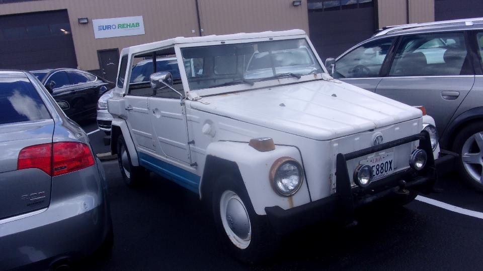 There were some pictures of a Jag E-Type they had restored, and we found a couple of interesting things out front. Well, one VW Thing and a modern Mini.