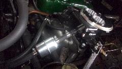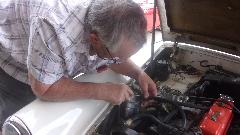 We had a little time today to look at Ed's Midget with the Weber carburetor. It can be a little hard starting, and it takes a while to warm up, but ultimately runs fairly well. We were looking for source of wet spot on top of the intake manifold, thinking it might be dripping fuel. But it wasn't dripping, and when the manifold was fairly hot the wet spot was still there. Eventually we found a loose hose clamp on the coolant catch tank, fixed that, and we think the dribble is fixed.