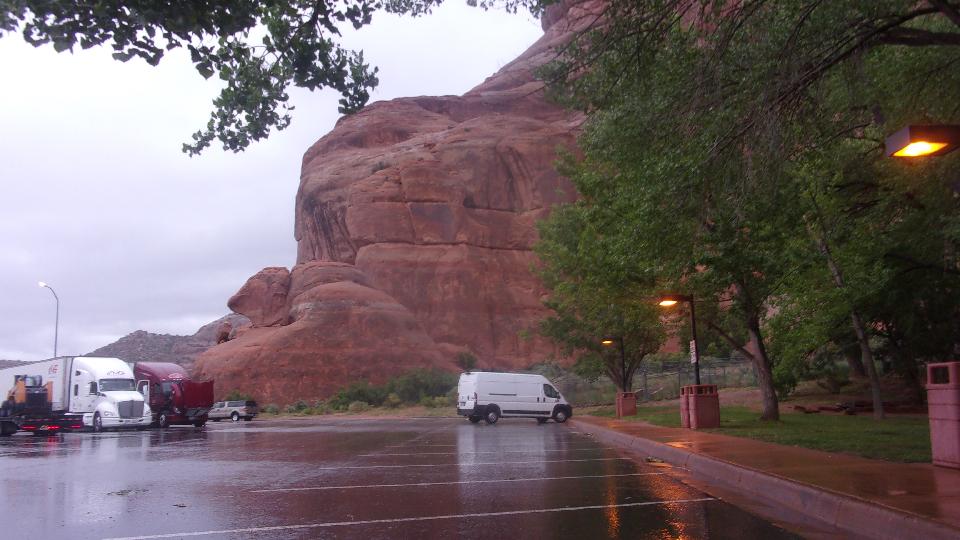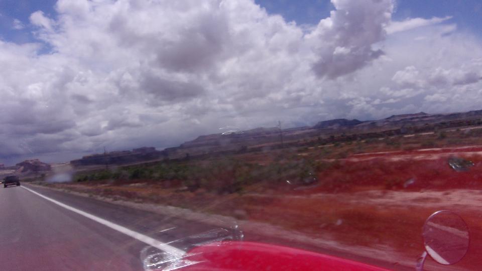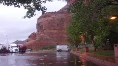 whom we have missed a couple of times in the past few years, but haven't verified him being home yet. Ugly looking storm and occasional small hail may have had something to do with the next decision. We decided to turn south on US-191 and head 33 miles into Moab, UT for another WiFi stop, not too far out of our way if the next appointment didn't pan out. After several text messages we finally had a confirmed appointment in Durango for tomorrow evening, so no rush. Late night found a rest stop 15 miles farther south.