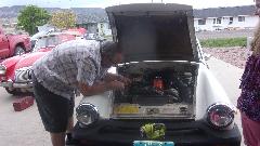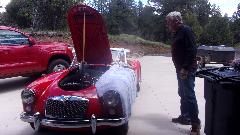 Ed was then spearheading an effort to mop off gobs of dirt and oil and greazy hand prints from the MGA. I was also scrubbing grease off the trailer hitch, and finally washing down the whole rig. Gotta admit that came out fairly well. Seems to be a tradition that the car gets washed at least once a year, whether it needs it or not.