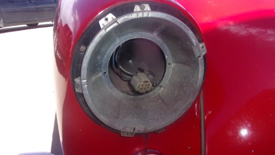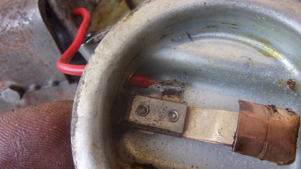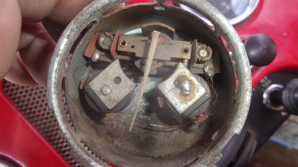 Having decided this was going to be a maintenance day, I took the easy job first to change out the dysfunctional fuel gauge. It has recently been intermittent, working about 20% of the time and getting worse by the day. When it did work it wouldn't register more then half tank when full, has been doing that ever since it smoked a few months earlier. Been carrying a replacement unit for three weeks, so it was time to install it. I was going to swap the chrome ring and face plate, so opened up the old one out of curiosity. It has endured a lot of humidity in the past five years, so I wasn't surprised to see some rust inside. Connecting the new one verified that it worked, so I installed the better looking face plate and chrome ring, installed it in the dash, and verified it still worked when finished.