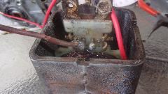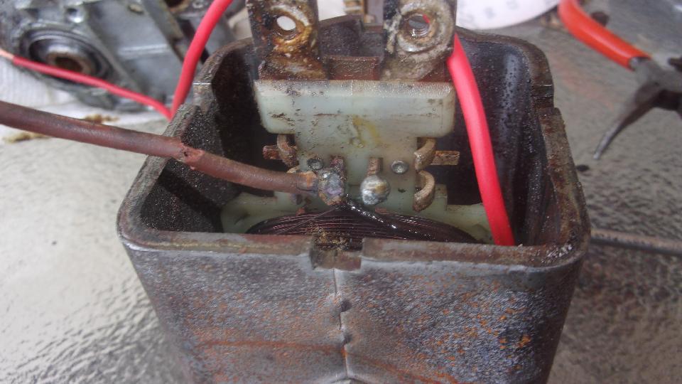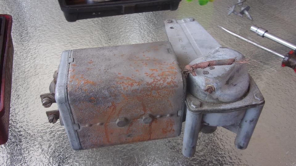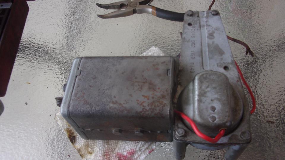 Then it was time to go after the wiper motor which had gotten so weak that it wouldn't move the wiper arms any more. I was guessing it had worn brushes, and I had procured new ones, but then a friend from Apache Junction, AZ gave us another wiper motor six weeks ago. I figured it should be easier to get that one working first, then just swap it into the car. It had a broken wire on the parking switch, so we proceeded to disassemble it for cleaning and to replace the broken wire.