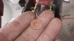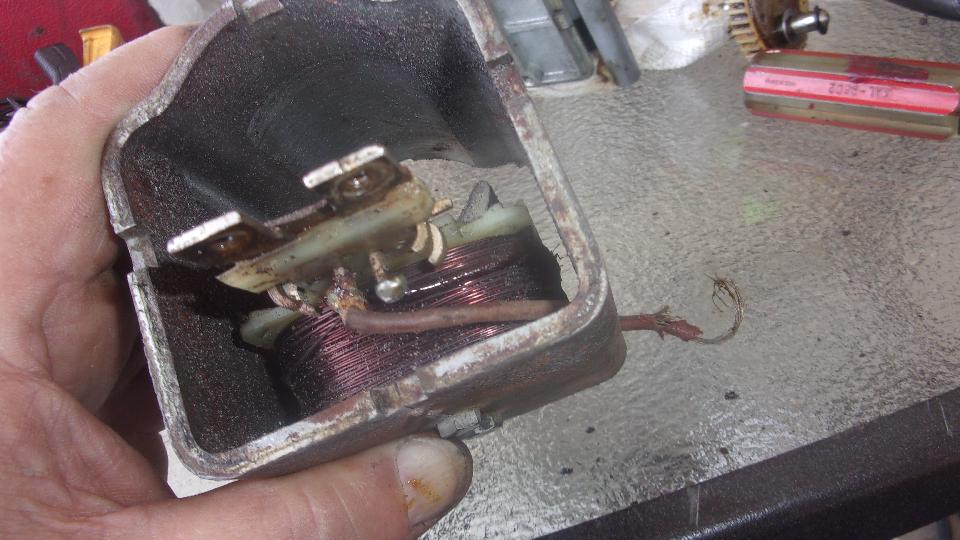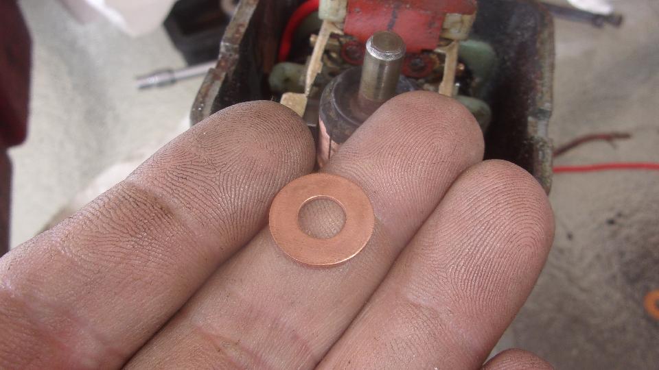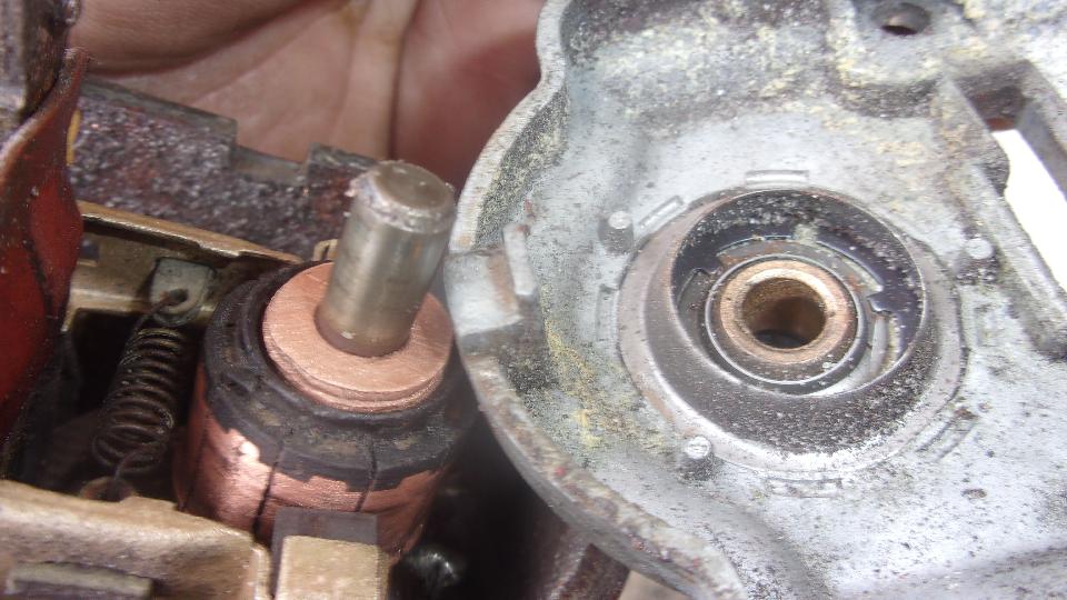 Discovering a lot of end float in the armature shaft (missing thrust washers), I fished some 1/4-inch copper washers out of the magic trailer. Had to grind down the OD a bit, and it needed two of those to eliminate the end float. We polished the commutator added a few drops of oil in the bushings, and had it back together and working in short order.