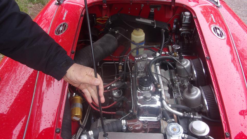 A little short on sleep, but woke up at normal time anyway. After email check and answering a couple of tech questions, we had a shot at tuning Hans' MGA 1800 with H4 carburetors. Not too bad at first glance, but after little poking around we found it running particularly rich on the rear carburetor. I wound the rear mixture nut up two full turns, and the idle speed picked up a couple hundred RPM and smoothed out the idle. Lifting the air floats slightly then indicated spot-on fuel mixture. Then checked ignition timing with a set-back timing light (vacuum disconnected) to find 12d BTDC at idle, and 25d TDC at road speed. I gave the distributor a little twist to set timing to 32d BTDC at road speed, resulting in 19d BTDC at idle, and a slightly faster idle speed. After setting idle speed back to normal it was nice and smooth. We don't care much about idle speed timing, except that mechanical advance from 19 to 32 is only is only 6-1/2 degrees in the mechanical advance weights (which seems a bit on the low end of normal). Having advanced the timing by 7 degrees, the car may be a little perkier (and should get slightly better fuel economy), but still needs a test run to validate the results.