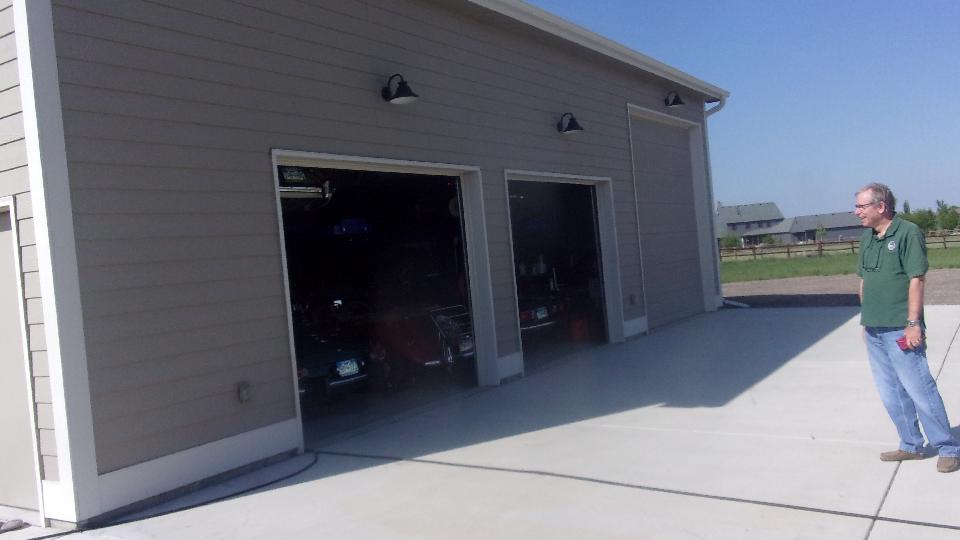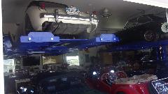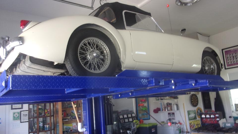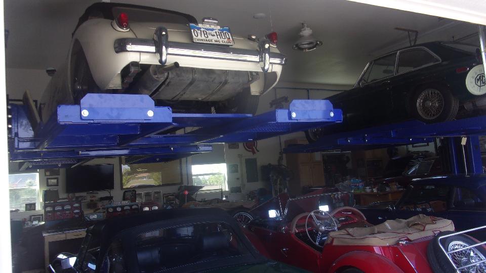 Last stop for the day (after business hours) was a friend Sherman Kaplan in Windsor, CO. We had been calling his number several times, but kept getting "all circuits are busy", so we just dropped in and rang the bell. Good move, as he was home, apparently not picking up the phone for an unknown number on caller ID. We wandered out to his little 3-1/2 car garage in back and began counting cars. First two doors had two single post lifts with two up and three down, and a sixth car in the next bay. Up top an MGA and MGB GT.