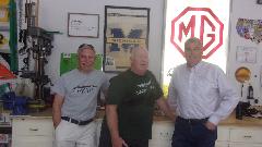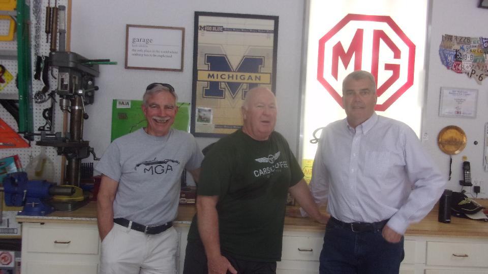 Smallridge in West Des Moines, IA, and he had apparently notified a couple of friends. That would be Lou in the center. It was fun to chat for a bit until the friends had to leave. We had in mind a little work on Lon's MGA, but it was sent to Colorado for service work, so no fun there.