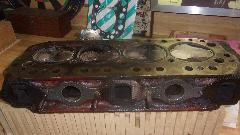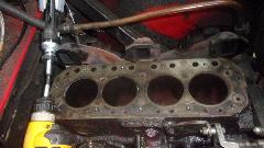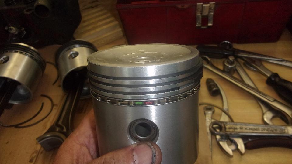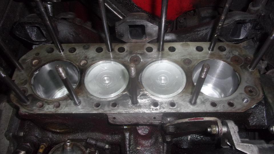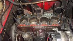 We removed the head studs and cleaned the top of the block. That's the new cylinder hone on the left of the first picture below. It seemed appropriate to start honing #3 cylinder first, figuring that would be the worst if anything was particularly bad. No problem here, as the bore cleaned up easily. Whatever small ridge may have been at top of bore disappeared in the first few seconds of honing. Very shallow scuff marks at the stop point of the top piston ring persisted for maybe three minutes of honing until the full bore was clean with even buff finish. Surprised at how easy that was, the other bores cleaned out just as quick. Wipe the deck and bores with solvent on a rag. Then wrap a rag around the hone, soak it with lacquer thinner, and use that to swab out the bores with slow speed of the power drill. Couple more clean rags with more solvent, and it was pretty again. Remove rags from crankshaft and wipe it down underneath. Not long to get the new pistons in, big ends buttoned up, oil pump and sump reinstalled, and the head bolts back in place, and a pizza break worked in there somewhere.
