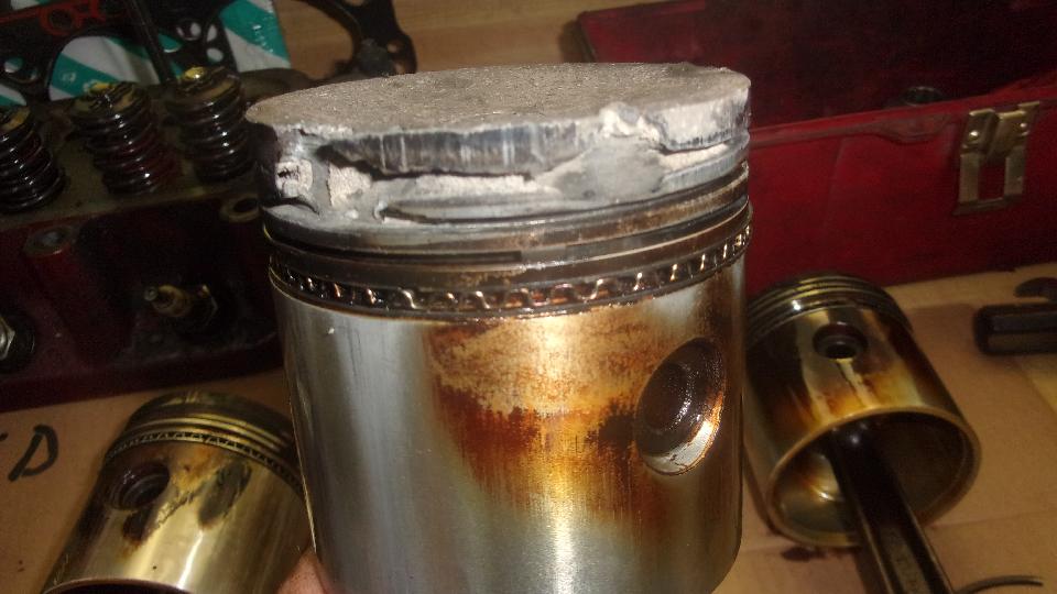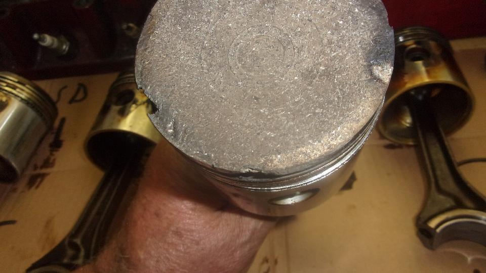Our MGA had been running somewhat poorly for a few days, and seemed to be getting worse. It would start on three cylinders in the morning, but ran fairly well on the open road, but then idle rough when we stopped for a traffic light. I was suspecting valves out of adjustment (or maybe a burned valve), as we hadn't checked valve lash for a long time. I did a compression test, finding 30-psi on #3 cylinder. So remove the valve cover and check rocker arm clearance, which was actually pretty good, foiling my theory that one valve might have zero clearance. Okay, bite the bullet and pull the head off for inspection. Set the head upside down and pour water into the combustion chambers, and nothing happened, no leaks to the intake or exhaust ports. Good news can quickly turn into bad news. If the head is okay the problem must be in the #3 cylinder. Yup, sure enough, we found a burned piston #3 with a visible small hole in the top at one edge.