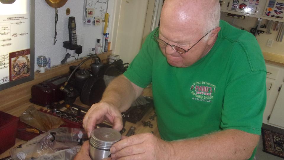 One pinch bolt and the wrist pin comes out. East to attach the new pistons, and not long to install the new rings. Maybe Lon never had his hands inside an engine, so I think he was having fun. We carefully place rags over the crankshaft to catch the fluid and swarf when honing the cylinders.