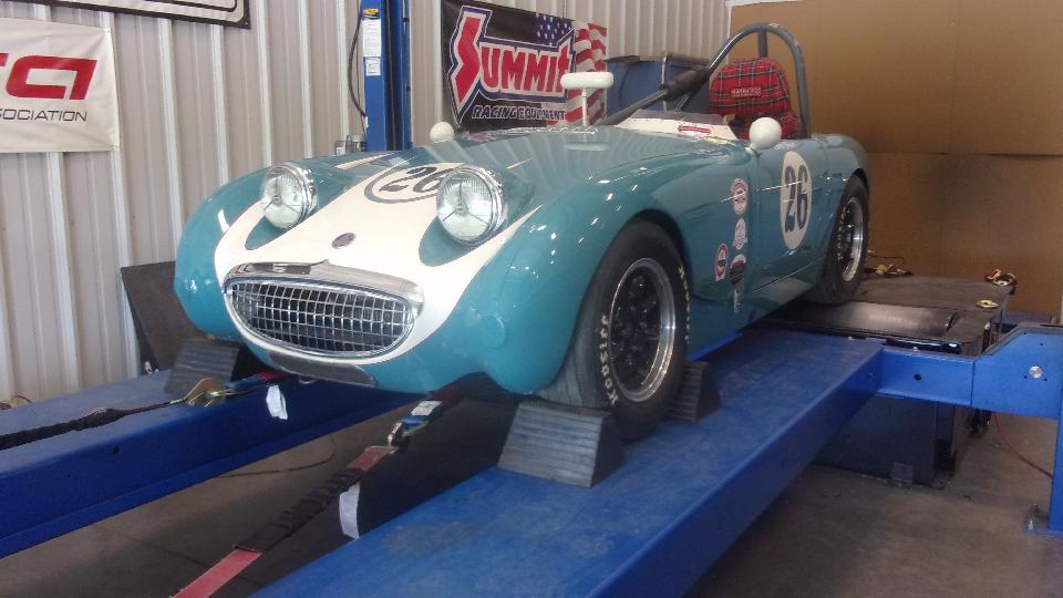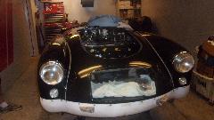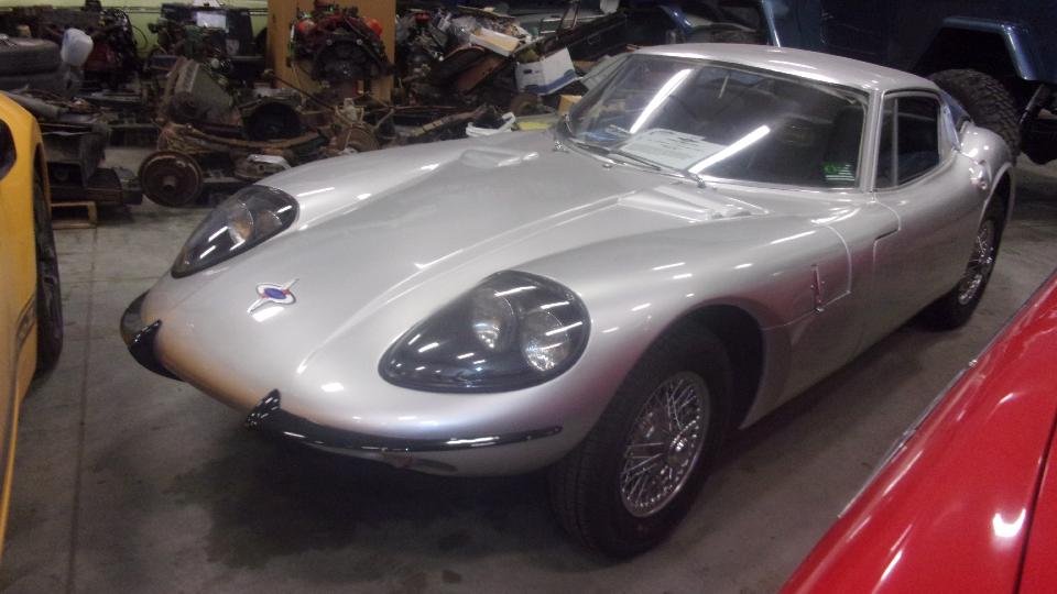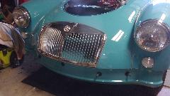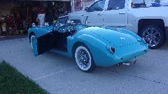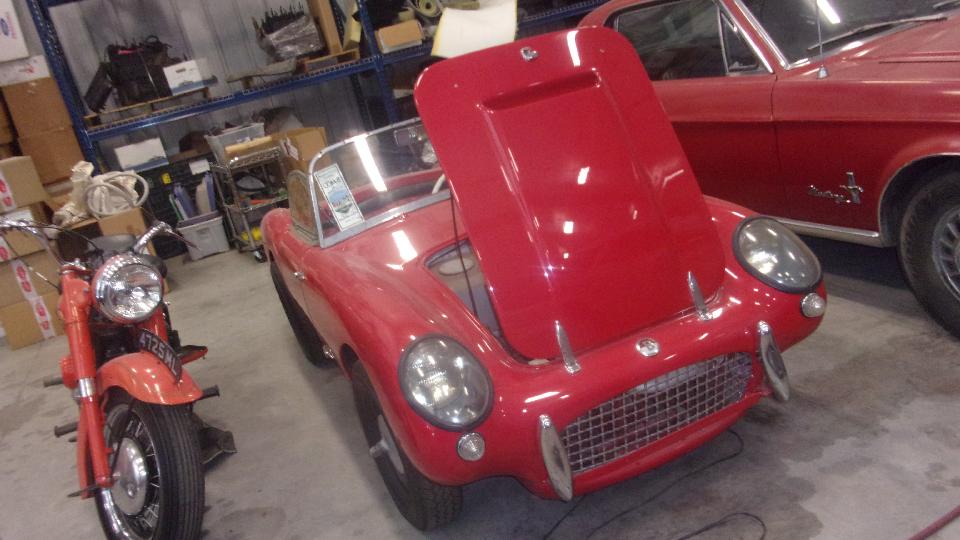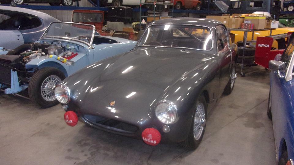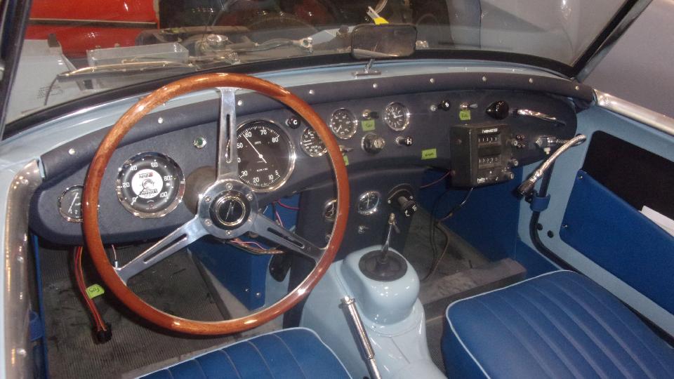 The grey car that looks like a Lotus Elite is actually an Austin Healey Sebring Sprite. Beside it sat a bugeye Sprite rally car with full rally instrumentation on the dash. I wish I could remember the next car, thinking maybe Marcos (but likely wrong), maybe someone can tell me later. Reason for that picture is because it is a prime example of chrome color powder coated wire wheels, which is sort of specialty of this shop.