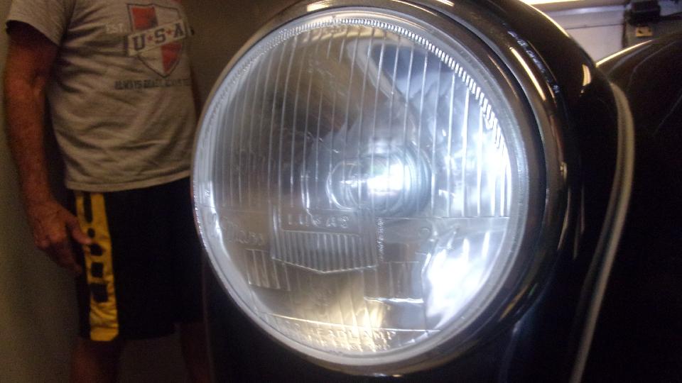 Smiling at the wiring harness with the correct cloth cover striping for the Twin Cam, and the Lucas Le Mans headlights (no idea where he found those). He has been doing a very nice job of detailing.