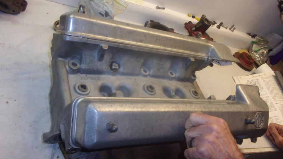 He has a Sebring style racing screen with the original factory style frame. The side brackets are shown here, very nice castings with the slightly greater rake angle, compared with the standard full height windscreen brackets. I will have to slip those photos into the tech pages for the factory racing screen. Then I got to scratch and sniff on the Twin Cam cylinder head, already reworked and ready to install, checking out the latest revision of the tappet buckets and custom porting work. Sorry we can't stay for dinner, tight schedule, gotta run.