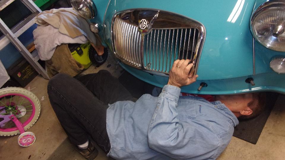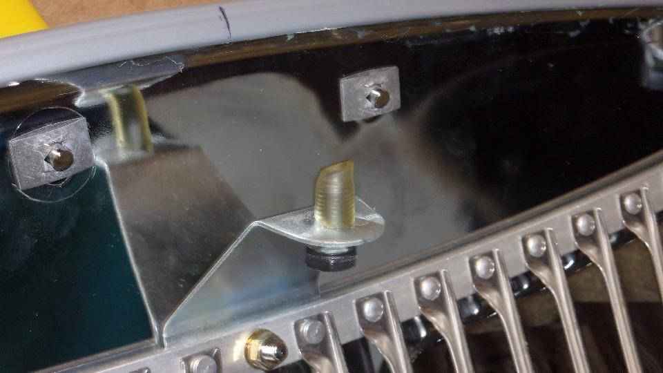 We reinstalled the grille with the top bolts inverted with plastic sleeves installed so the top could be inserted and the unit fastened with bottom bolts only. That allows the grille to be removed from bottom bolts only in case the bonnet latch might ever get stuck or disabled.
