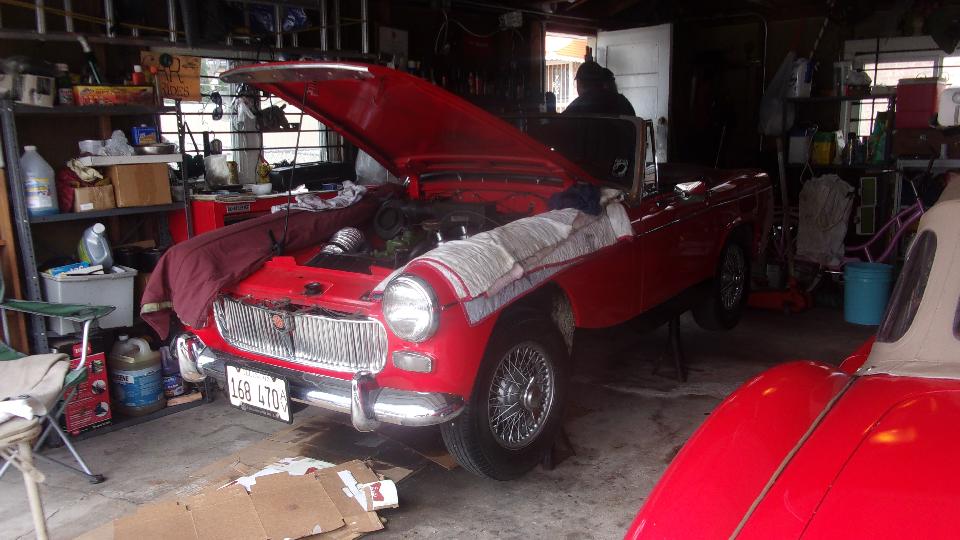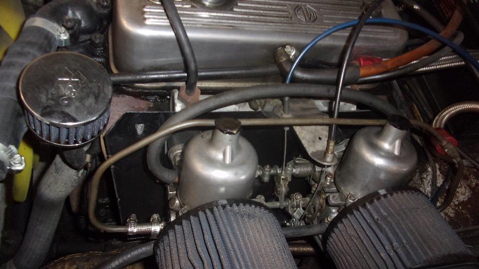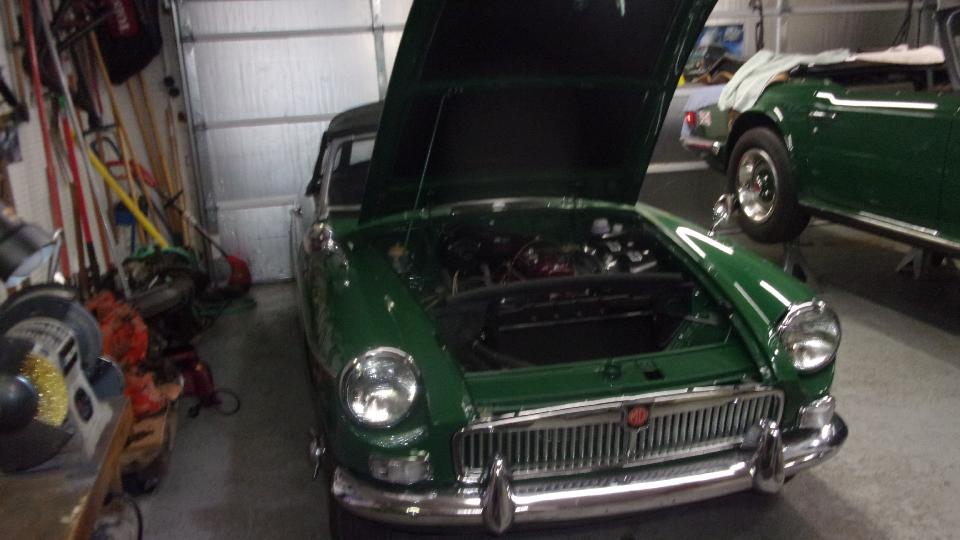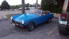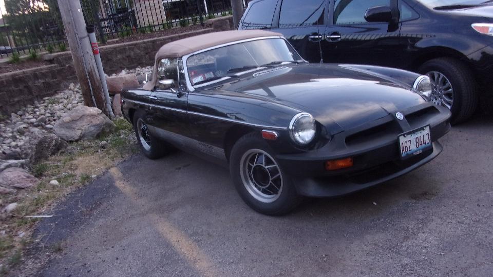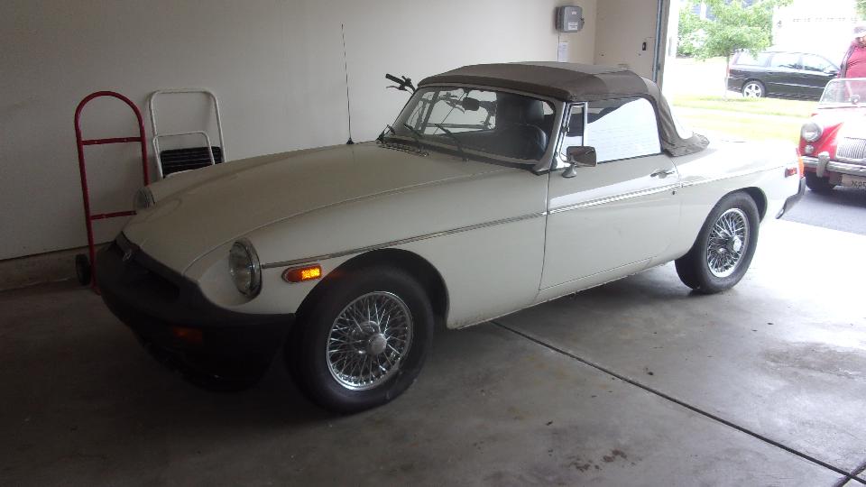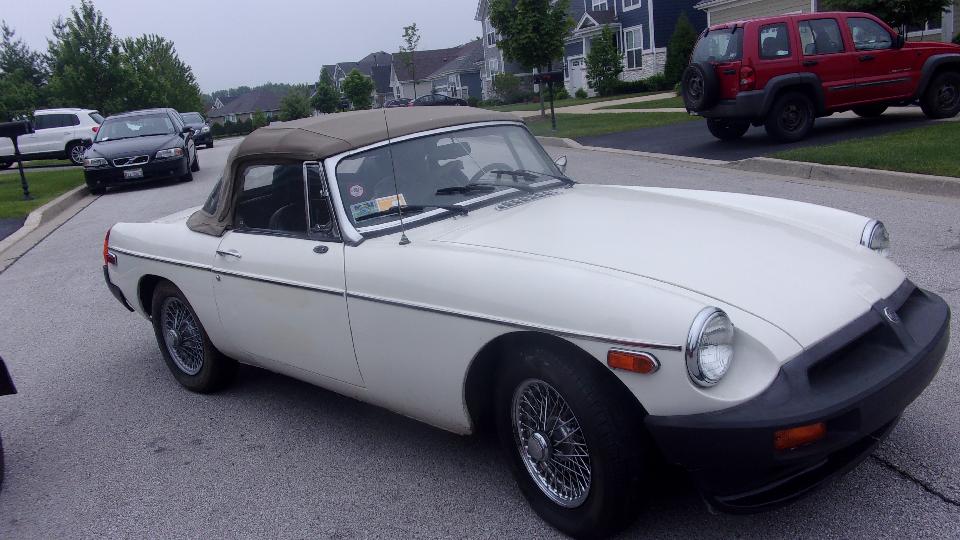 in Winfield, IL. The objective today was to revive his 1974-1/2 MGB that had been sitting for two years. This is a factory issue rubber bumper dual carburetor car, kind of rare. It still had most of the air in the tires, 1/4 tank of fuel, and SURPRISE, enough battery power to crank it over. Crank, crank, crank, no start. Checked out good fuel flow at the carbs, so I gave it a good spritz of starting fluid in the air cleaners, and it fired up and ran, fairly well actually. That was a surprise as well, considering the fuel was at least two years old. It was running a little rich, but after a mixture adjustment it settled down to a nice purr.