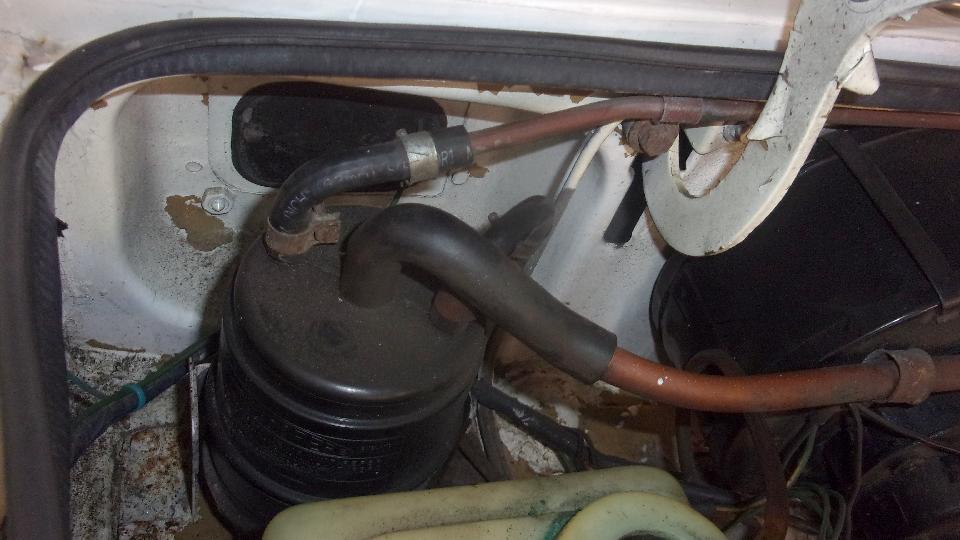 No air pump or air injection pipes, which is okay. Plumbing to the carbon canister and anti-run-on valve was still in tact, which was good. We had some discussion about the extra air filter on the front tappet cover vent, which was disabling positive crankcase ventilation and purging of the carbon canister. There was a hose connecting venturi ports on the two carburetors, which was effectively the same as two corks to plug the ports. It was agreed to order up three hoses, a "Y" connector and some hose clamps to put this back as original to restore positive crankcase ventilation and purging of the vapor recovery system.