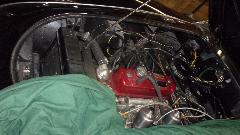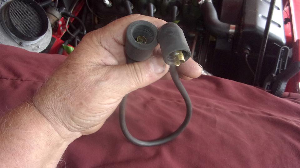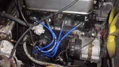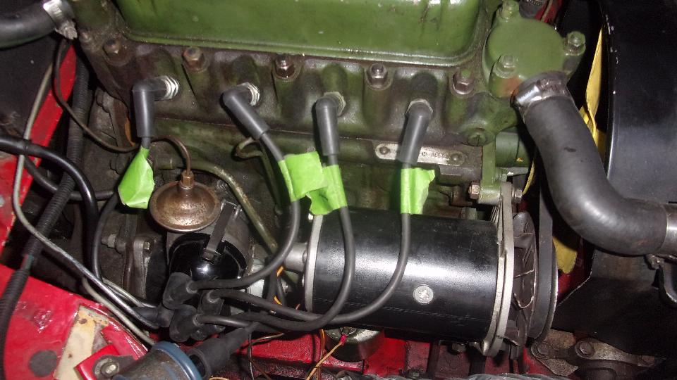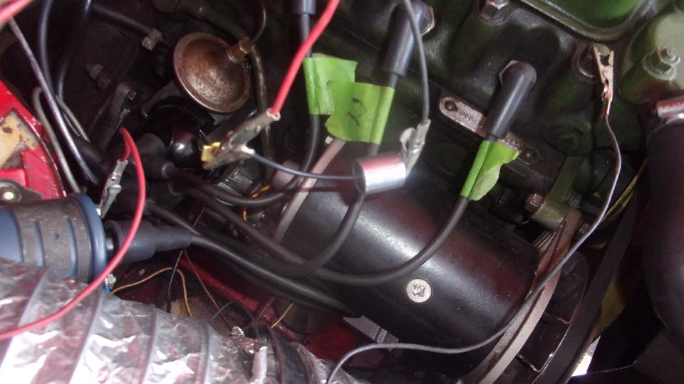 again. Story was it might run, but very badly. So we tried cranking it up, but no fire. Gave it a good sniff of starting fluid, but still no fire, so must be no spark. Pull coil HT wire from distributor cap, hold the wire end close to the block and crank it, finding no spark. Pull the HT wire out of the coil to do a continuity and resistance test with an ohm meter, finding about 4000 ohms for a foot long resistor wire, which is good, so no problem there. Best guess then was a bad condenser.