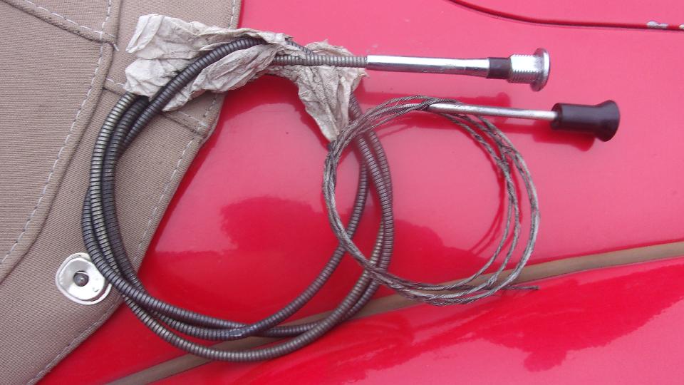 not even hammering it with my fist. So I had to disconnect the cable at the carburetor end before we could drive the car. Later in the day when time allowed I removed the choke cable from the car, and pulled the wire out of the jacket, finding one strand of the wound wire cable dislodged. When it caught in the jacket, and I was pushing hard trying to return the choke pull, the single strand of wire uncurled a bit and jammed all the way up the cable from end to end, working quite effectively as a one-way catch to positively prevent return of the center cable. Weird would be a good word for this. Left it out of the car, need to order up a new choke cable soon.
