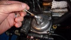 After warm up, a hard blip on the throttle resulted in backfire through the front carburetor. No oil in the front dashpot damper, so that was easy to fix. Then we took it for a test run, and it ran like crap under load, pop, bang, backfire all round the block, so back to the garage. Rich said it ran like that two years go, which is why it was parked. I was about to try a new condenser in the distributor when I spotted another problem.