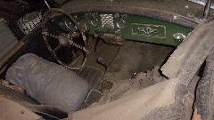 Slept in an extra hour (to compensate for jet lag), breakfast and email check. Going on 11-am (considering the time zone change), still an hour and a half from our next appointment, so need to get rolling again. Arrived early afternoon to visit Eric Sinclair in Bloomington, IN. He is really from Chicago, just cleaning up a house down south in Indiana. We were here to check out an MGA 1600 that "ran when parked", but has been in storage for about 25 years. His father bought this one new, so there is some personal attachment to it, a little, but probably not enough to get it restored. Kind of sad, this one, surely been decomposing gradually all this time. The fabrics are all shot, parking brake seized up so it won't roll, 3-1/2 flat tires (a little air in one), guessing the engine may be seized as well. Had to evict an opossum a while back.