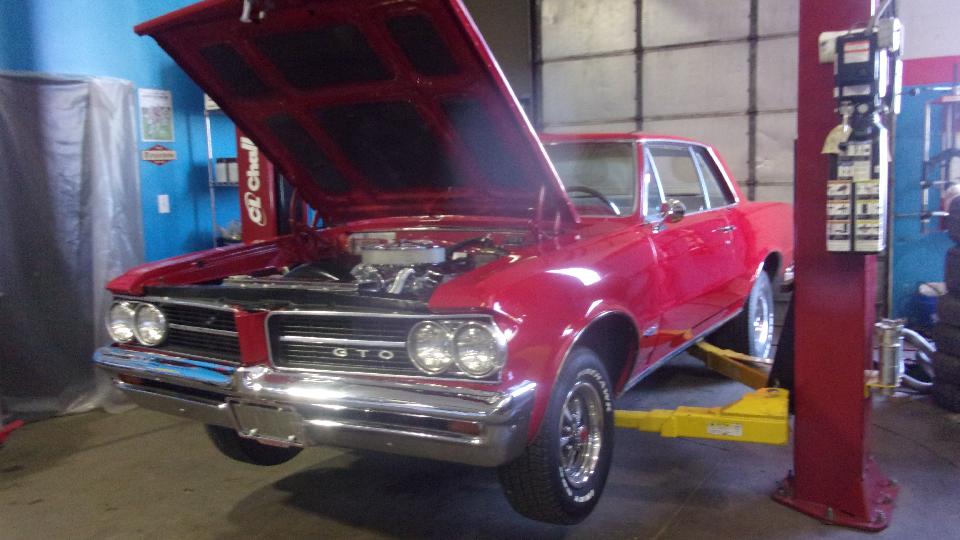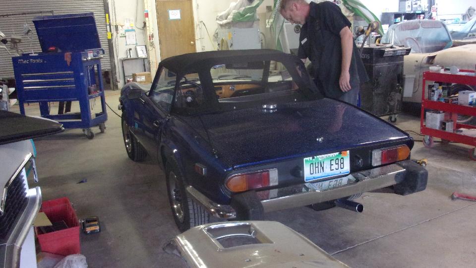Under the tarp was a restored TR6 chassis waiting for the body to come back from the paint shop. The Pontiac GTO was peachy clean, more representative of the American iron they work with. That's Dave's partner with a picture of the MGA he used to race (and I think he bought it new).