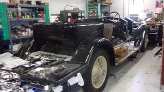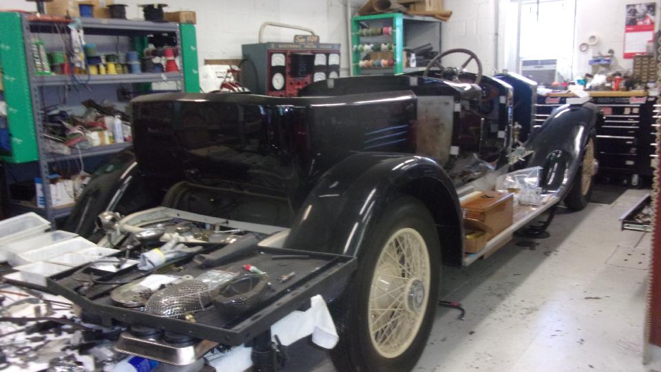 typical vintage British iron there was a 1923 Rolls Royce the came in with a separate body to be assembled. The body was originally a hearse not exactly matching the chassis, so they had to shorten the bonnet a few inches to fit, chop the rear end considerably, make new seats and most of the interior parts, in the interest of restoring it as a touring saloon (more like an opera car).