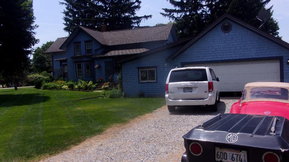 We had time for a late lunch (and WiFi break) before our next appointment. In the evening we dropped in to visit David Sheward in Thornville, OH. He has a 1955 MGTF 1500 with a sizzling engine and fat tires, an MGB (hiding somewhere else) with an hotter engine, an nifty Opal GT with some special mods (like air conditioning), and (kind of by accident) a TR7 with some carburetor problems (hiding under the tarp). He also has a large workshop with a lift, which we didn't need today. Since it was evening with no more appointments for the day, we got to chatting on and on until is was past midnight, and we had to be rolling on.
