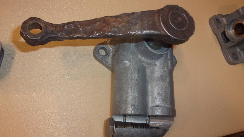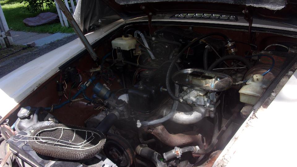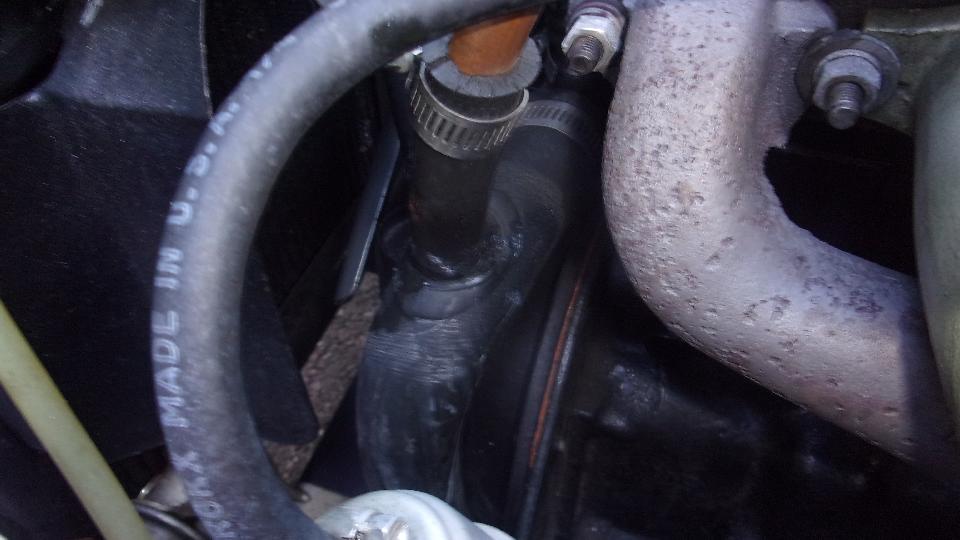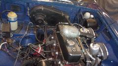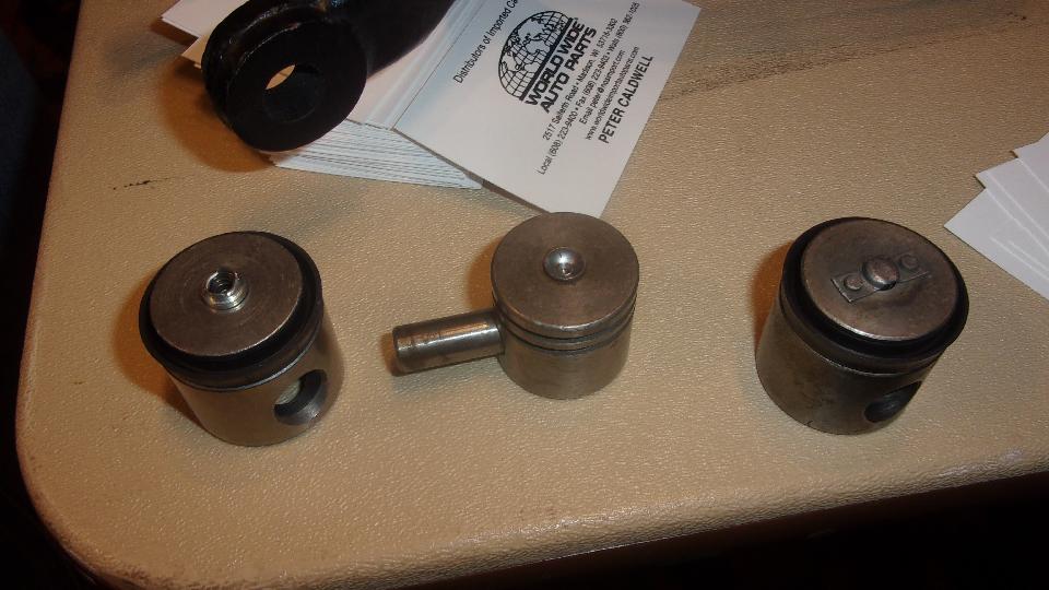While we were chatting a flat bed arrived to unload the chrome bumper "roll-up-window" MG Midget with another Weber carburetor and a fiberglass bug-eye Sprite front end (cute modification). It had a nasty coolant leak from the 3-way molded rubber radiator hose (easy fix with the right part), and master cylinder with internal leak due to deteriorating rubber seal cups (wants a new master cylinder).