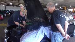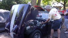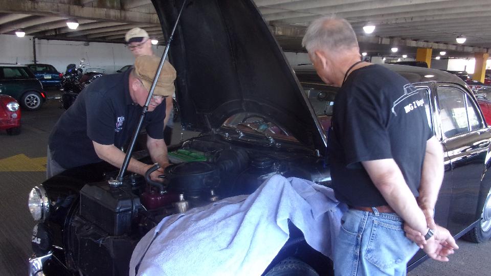 The first morning tech session was a repeat of Kent Prather and the rear seal installation for 3-main bearing engine (I skipped the repeat). Second morning tech session didn't happen, because the presenter didn't show up, so I wandered down to the parking garage to drop in on John Twist's rolling tech session. He was doing tune-up work on a Magnette by the time I arrived. Next up was a nice MGA, on which I quickly spotted a missing lug nut (not why it was there).