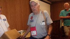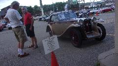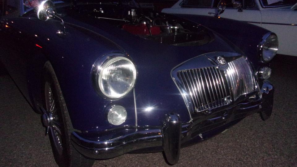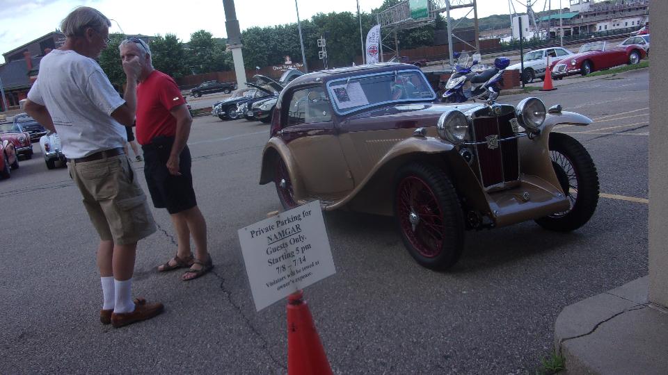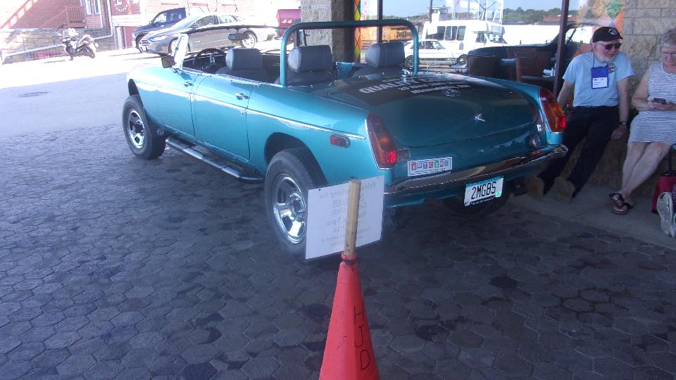 In the evening we attended the First-Timers and Welcome Party (combined this year). Had an extended chat with a newcomer, and more chat with a bunch of old friends and a few new ones, and got to chew the rag with John Twist for a while. As the light was failing I had another stroll round the car park to check out new arrivals. Lew Palmer is selling his 1936 MG PB Airline Coupe (in case anyone might be interested). There was a nice factory issue 1976 MGB GT V8 (mostly original). Also a nice MGA with an "oops" in front from rear ending an MG Magnette on the way to the event (both cars with the same owner).