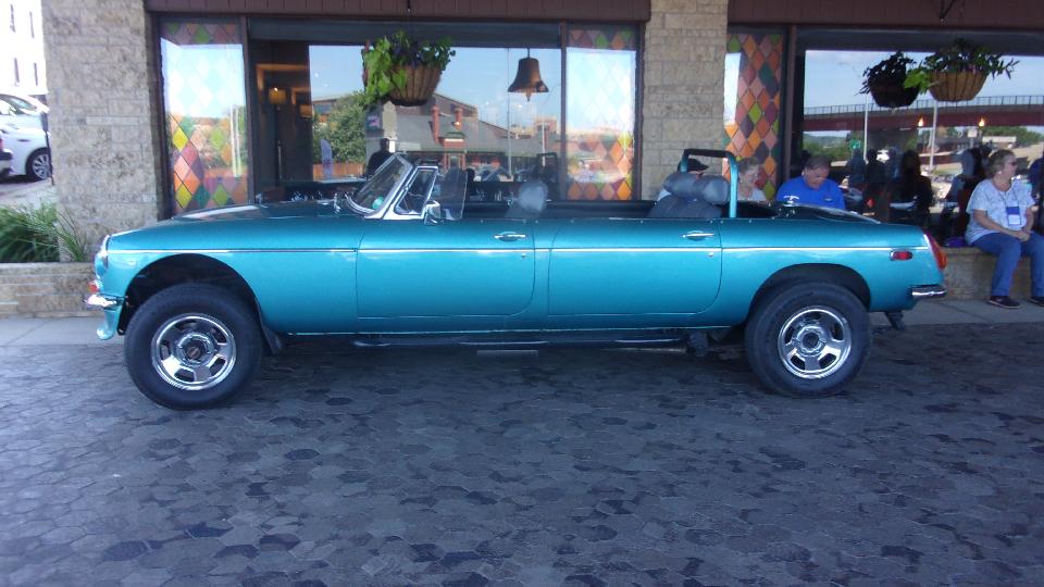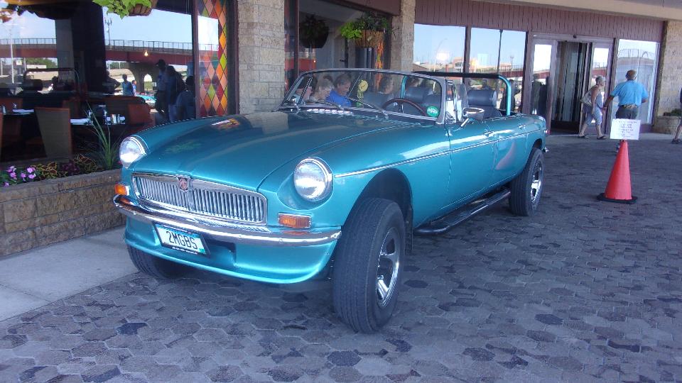 Then the 4-door MGB rolled in, compliments of Quality Coaches Inc in Minneapolis, Minnesota. Not long enough to be a limousine, but a four door convertible is unusual (as well as the jacked up off-road configuration). Turns out it was assembled form two MGB and a Nissan truck chassis.