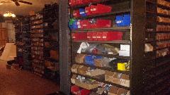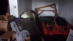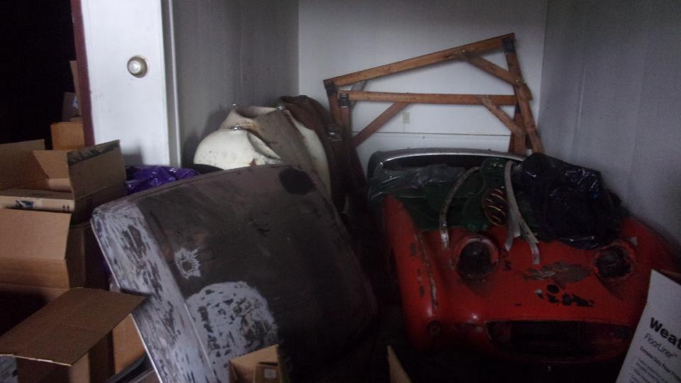 There is a warehouse full of parts, new and used, for most anything vintage British. The cute red thing is a fiberglass engine bonnet with glass display window for an MG 1100, original factory issue back in the day.