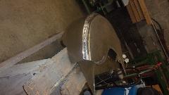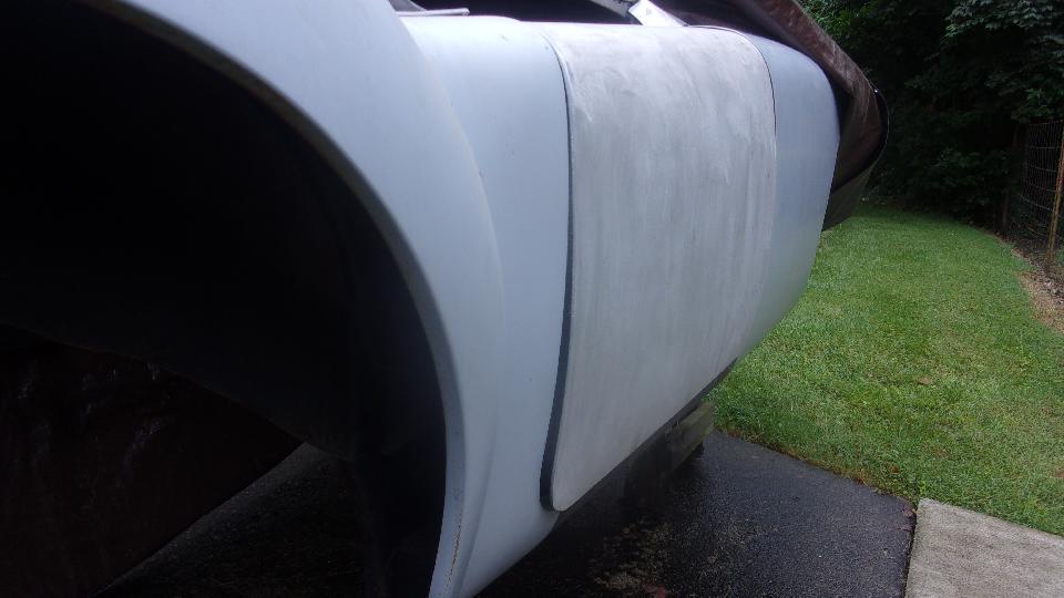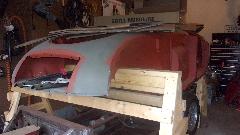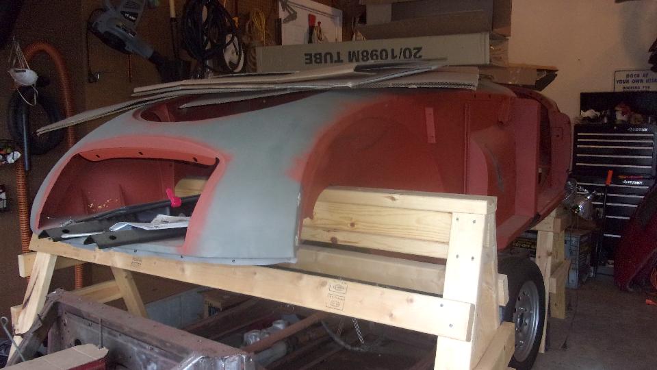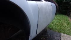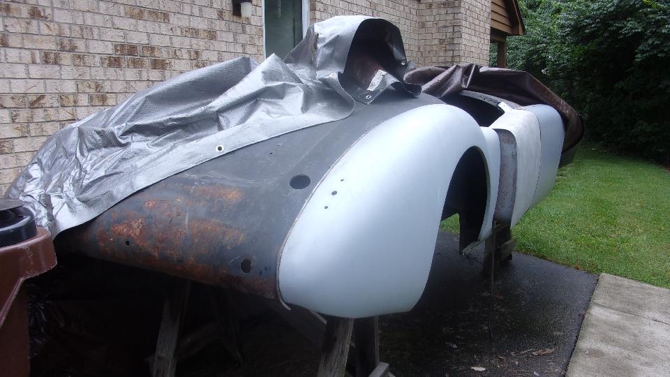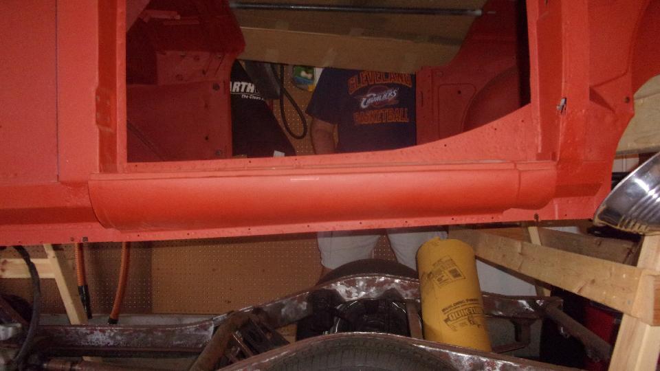 later Marc dropped in to see us. Surprise! We finally toddled back to his place for a look at his project MGA 1600-MK-II. Don't be shocked, the first picture below is just a spare part. The second picture is the one he is restoring. Blasted and primed with some metal replaced, still some Swiss cheese needing to be repaired. Bit of a problem with the rocker panels, too short in length (which could be fixed in situ), but also likely too tall on the sides being more of a problem. These may have to come back out for proper fitting.