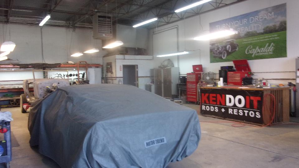 While we were there we found two more businesses at the same address, in the same building unit. There was Capaldi Enterprises Inc (James Capaldi, president), restoring classic cars. They had a Jaguar E-type in the paint booth today. There was also KenDoIt Rods + Restos (with Ken Cerri, president) doing total restoration, mechanical, fabrication, body work, finishing, wiring. Both of those business are tied to the web site http://capaldicars.com. They do high end restoration work (bring a fat checkbook).