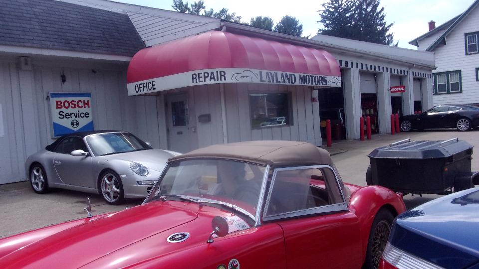 The shop is now called Pierre's Garage in Shiloh, Ohio, several miles to the north of Mansfield, and it was only this morning that someone finally told us where to find the place. It is fairly well tucked away on a side road, and he has enough business with regular customers and referrals that he doesn't need to advertise. While Pierre still works on vintage British cars, he is also certified to work on all of the latest electronic stuff. That's a new Mustang getting an engine tweak.